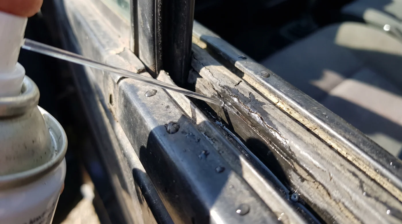 - Vaporizza generosamente e senza paura lo spray al silicone puro direttamente all’interno della scanalatura verticale, partendo dal punto più alto del telaio fino a scendere verso la lamiera.