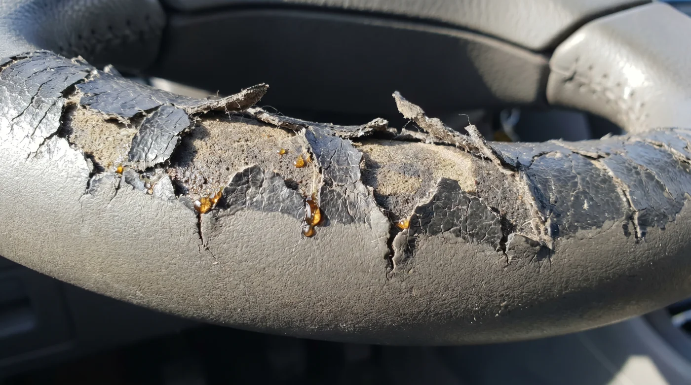 Una volta che la barriera poliuretanica cede, la pelle nuda sottostante si ritrova esposta all’aria, all’umidità e ai raggi solari. Si secca, si crepa e si sfalda a una velocità impressionante, trasformando il tuo abitacolo in un disastro estetico e deprimendo drasticamente il valore residuo del veicolo.